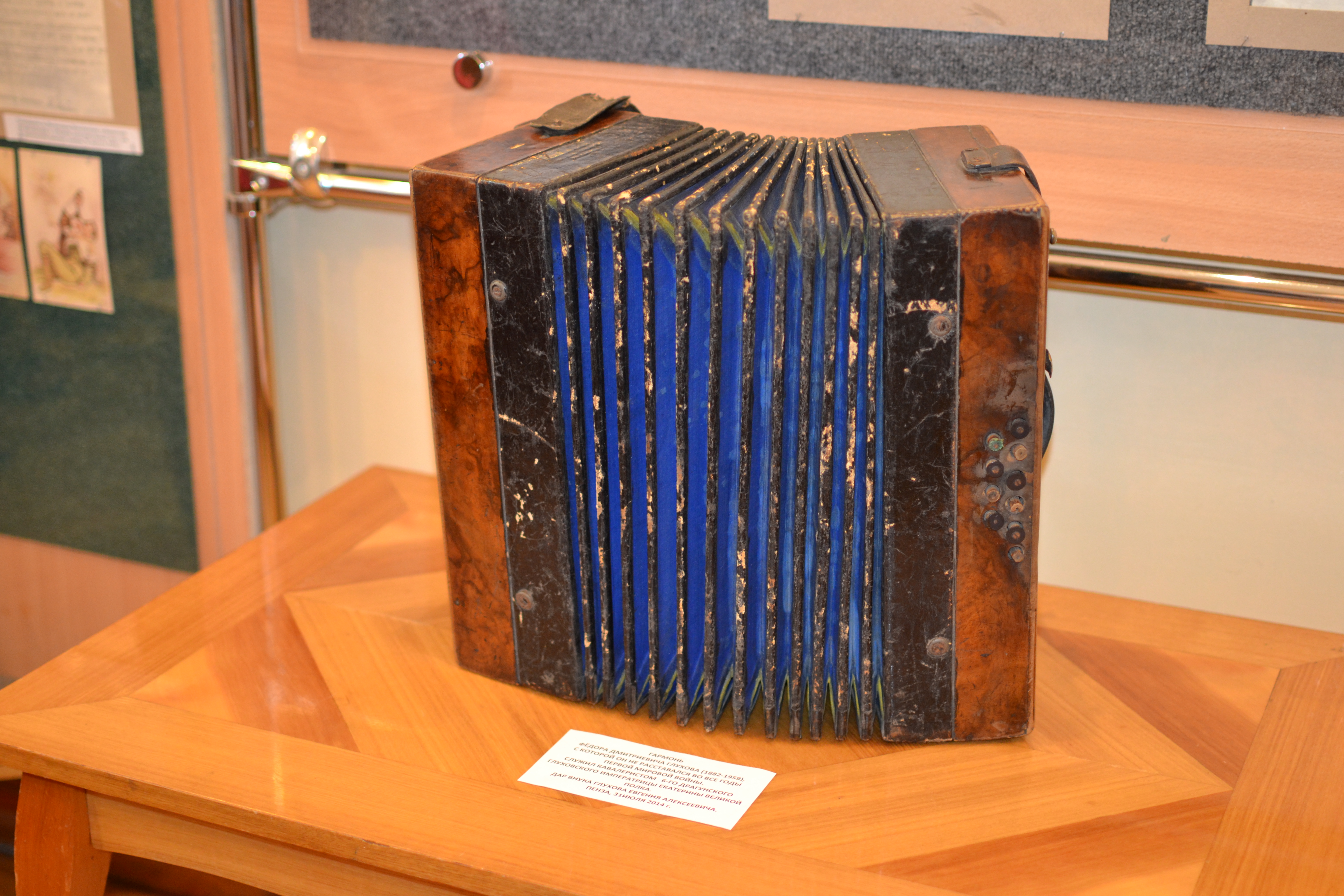 Эту гармонь накануне открытия выставки принес пензенец — Евгений Глухов. Его дед Федор Глухов на протяжении всей войны не расставался с этим музыкальным инструментом и поднимал дух однополчан веселыми песнями.