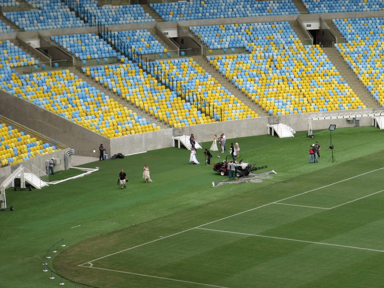 Очень странно было смотреть на невест, разгуливавших по полю и снимавшихся на фоне пустых трибун.