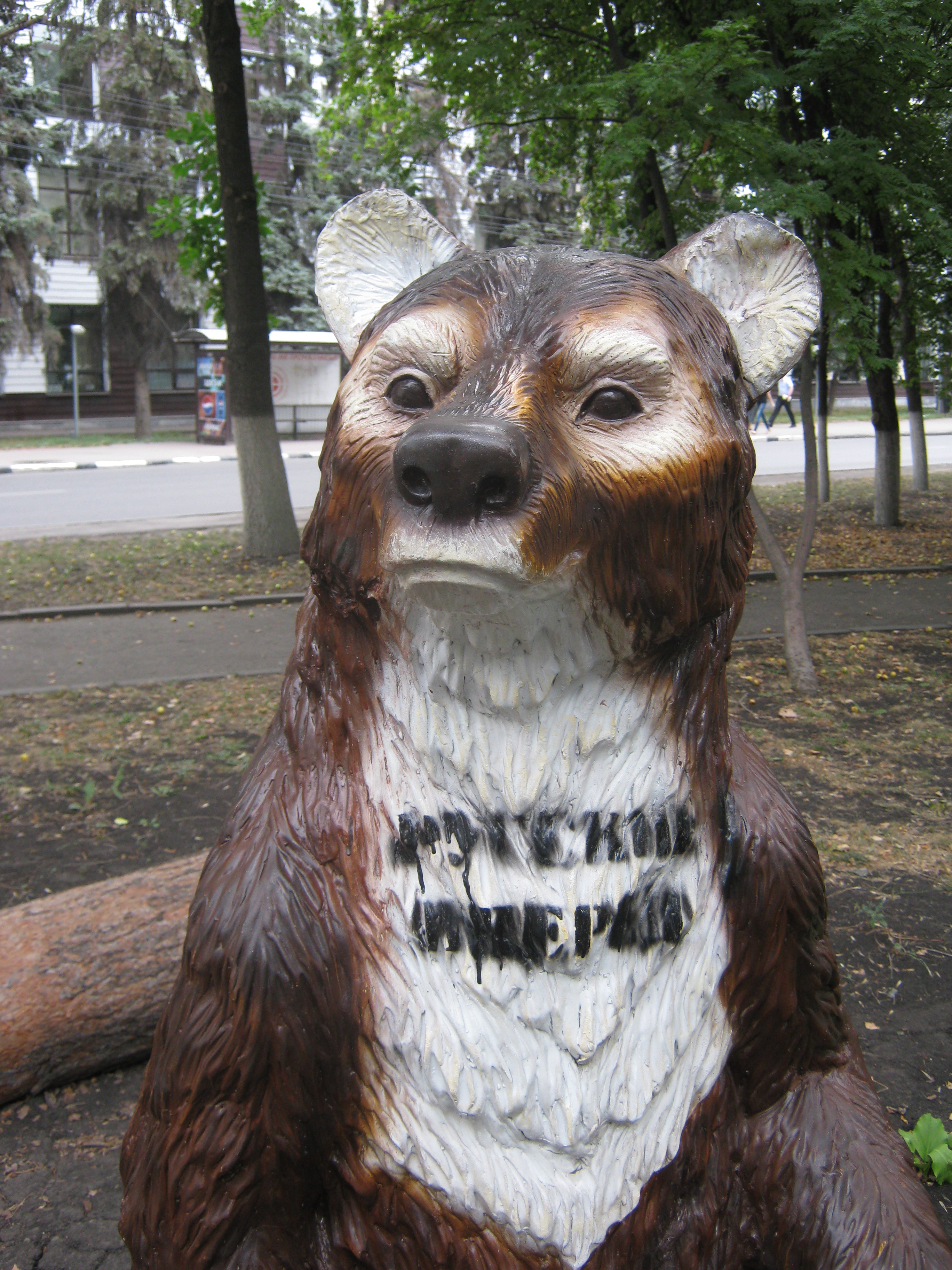 Медведь, "украшенный" популярным в среде националистов лозунгом, простоял почти неделю, прежде чем 19 августа сотрудники МУП "Зеленое хозяйство города Пензы" не закрасили надпись.
