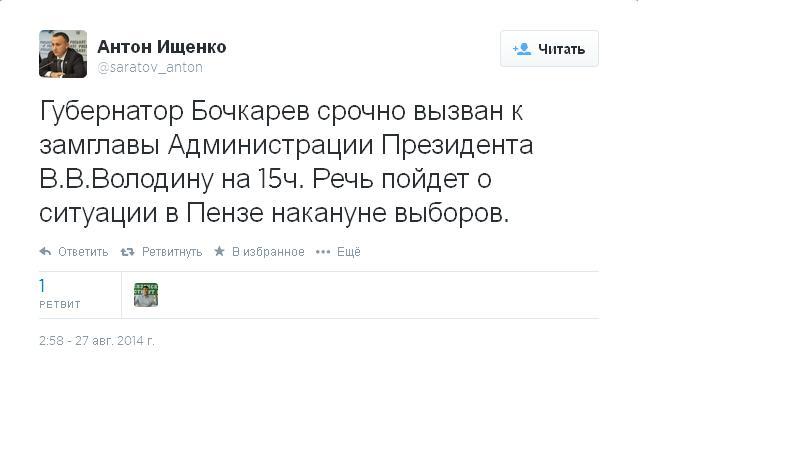 Сегодня днем губернатора Пензенской области Василия Бочкарева срочно вызвали в Кремль для беседы с замглавой Администрации Президента Вячеславом Володиным. Об этом сообщил в своем микроблоге депутат Государственной Думы Антон Ищенко, который баллотируется в Пензенскую гордуму от ЛДПР. По его информации, речь на встрече шла о ситуации, которая сложилась в Пензе накануне выборов 14 сентября.