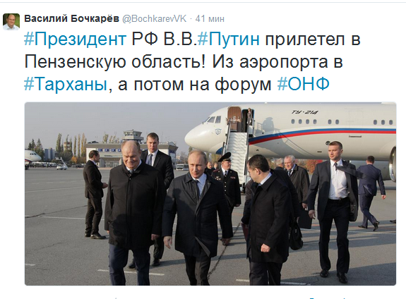 Об этом стало известно после того, как Василий Бочкарев, губернатор Пензенской области выложил совместное фото вместе с президентом в соцсеть Instagram и Twitter. Также губернатор сообщил, что несмотря на задержку, Владимир Путин сначала все-таки отправится в Тарханы, а уже потом на форум ОНФ.