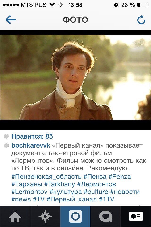 Так, вчера губернатор в социальной сети "Инстаграм" разместил пост о том, что по 1 каналу идет прекрасный фильм о Лермонтове. Также Василий Бочкарев советует всем его посмотреть.
