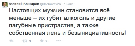 Помимо этого губернатор в "Твиттере" обсуждает достоинства настоящих мужчин. Так, сначала Бочкарев поздравил мужчин с праздником, а потом высказался по поводу того, каким должен быть настоящий пензенец.