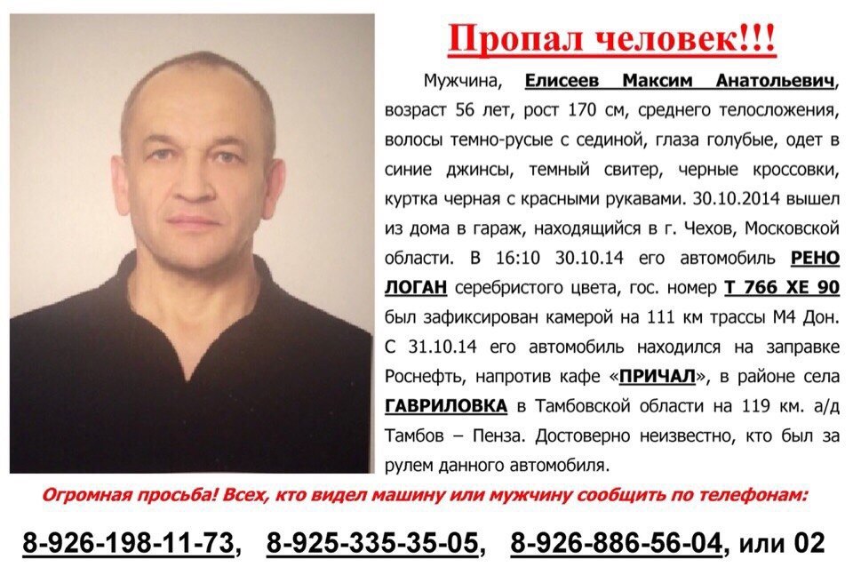 Известно, что 56-летний Максим Елисеев, проживающий в городе Чехов, 30 октября вышел из дома в свой гараж, после чего не вернулся. Позднее его автомобиль был зафиксирован камерами наблюдения на 111 километре трассы М4 "Дон". На следующий день его автомобиль находился на автозаправке в селе Гавриловка. Достоверно не известно, кто был за рулем автомобиля пропавшего.