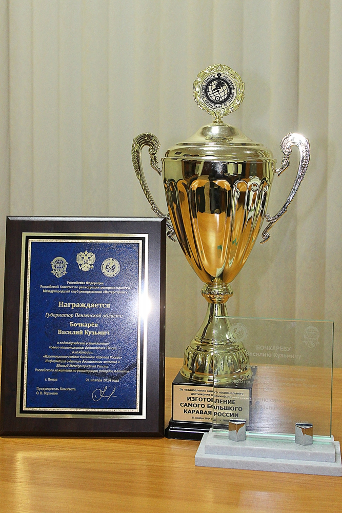 Губернатору Пензенской области Василию Бочкареву вручили памятный Кубок и свидетельство, подтверждающие установление нового национального достижения России в номинации "Изготовление самого большого каравая России".