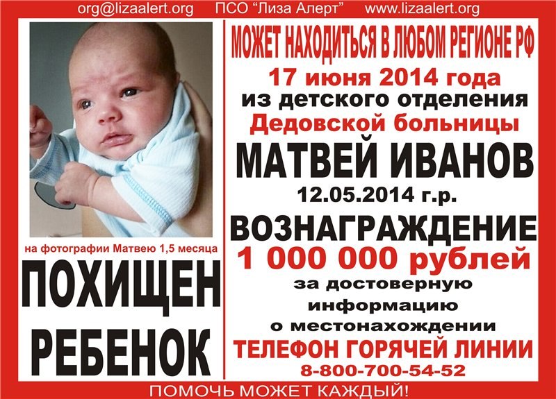 За достоверную информацию о текущем местонахождении ребенка родители Матвея предлагают вознаграждение в миллион рублей. Сообщить информацию можно по телефону 88007005452.