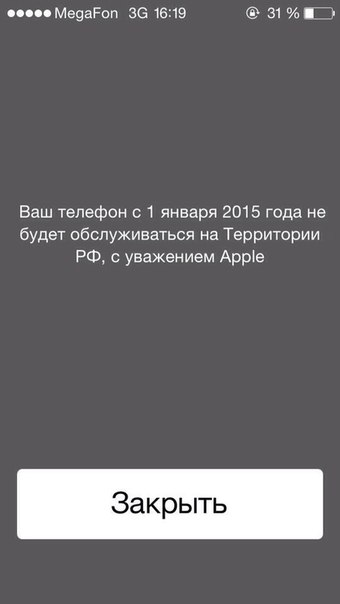 Недавно в социальных сетях появились фотографии айфонов пензенцев, на экранах которых было отображено входящее сообщение от неизвестного отправителя. В тексте сообщения говорится о том, что с 1 января 2015 года телефон не будет обслуживаться на территории России. Пометка в конце сообщения указывает на то, что отправителем якобы является компания Apple.