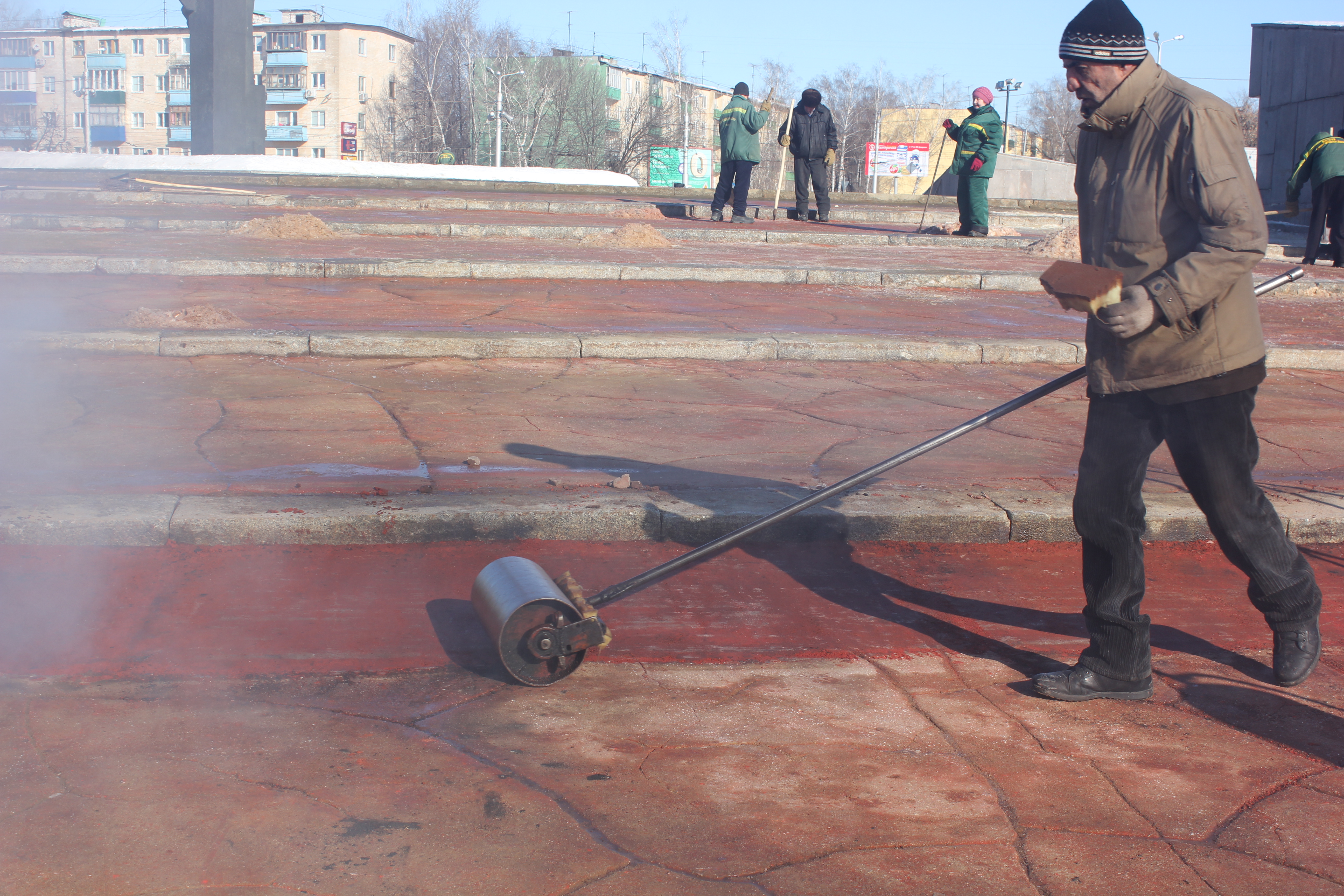 У памятника Победы, как и на дорогах, большое количество работников. Однако они занимаются не только очисткой памятника от снега и наледи. Часть рабочих занимается укладкой красного асфальта на лестницы.