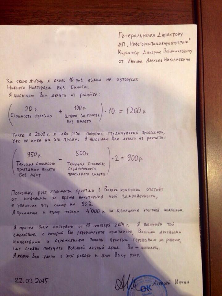 Нижегородец передал в «Нижегородпассажиравтотранс» 4 тысячи рублей и заявление, в котором написал, что за всю жизнь около 10 раз ездил «зайцем» в общественном транспорте. Он рассчитал, что сумма, которую он должен возместить муниципальному перевозчику, равна 1200 рублей.