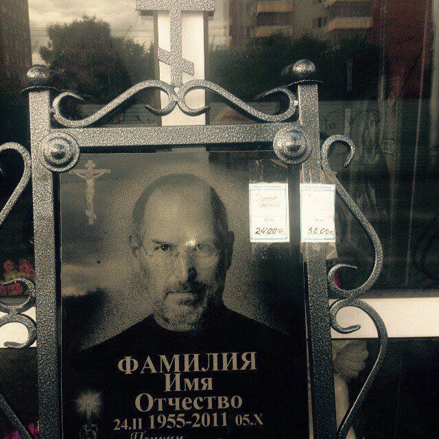 В Пензе располагается точка продаж памятниками. Ритуальная компания прибегла к необычному рекламному ходу. На входе в помещение расположена мемориальная доска с изображением Стива Джобса.