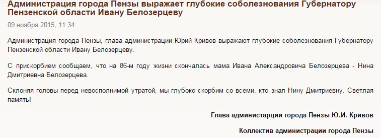 Как сообщает официальный портал администрации города, 9 ноября скончалась мама Губернатора Пензенской области Нина Дмитриевна. Виктор Кувайцев, Юрий Кривов и Валерий Лидин выразили свои глубокие и искренние соболезнования Ивану Александровичу.