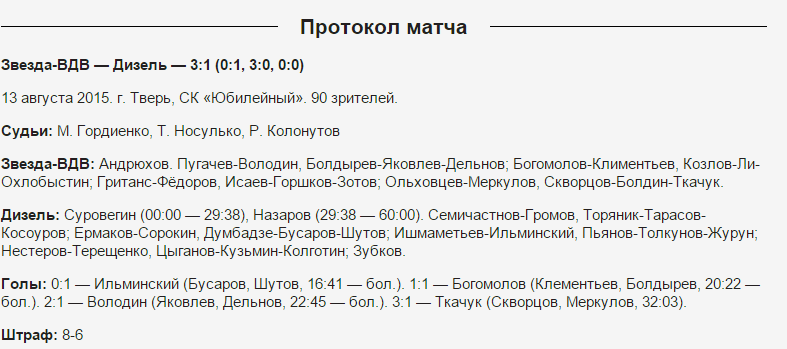 В Твери 13 августа «Звезда-ВДВ» проверила на прочность подопечных Андрея Никишова. Воодушевленные предыдущей победой над красноярским «Соколом» со счетом 6:3 «Дизель» начал активно игру против дмитровской команды. Желто-синие дважды играли в большинстве в первом периоде. Хоккеисты смогли реализовать полученный от соперника «подарок», открыв счет в матче. Шайбу забросил Сергей Ильминский.