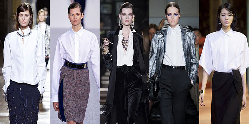 В тренде остаются классические белые рубашки традиционного кроя с воротничком и на пуговицах. Также в коллекциях много интересных моделей с запахом, воротником-бантом, в ретро-стиле с объемными рукавами и воротником хомутом. Выбирайте пастельные оттенки и густые бордовые, сиреневые, синие и коричневые цвета. Из принтов обратите внимание на полоску, цветочные и абстрактные узоры.