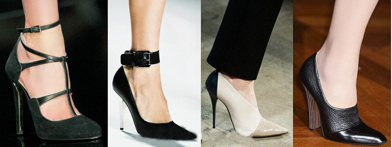 Хит сезона: закрытые модели с острым или полукруглым носком, с ремешками и пряжками, а также с контрастными по цвету каблуками или мыском. Возвращаются в моду обувь 40-х годов - аккуратные туфли с мягкими линиями, Т-образными ремешками и обрезными каблуками.