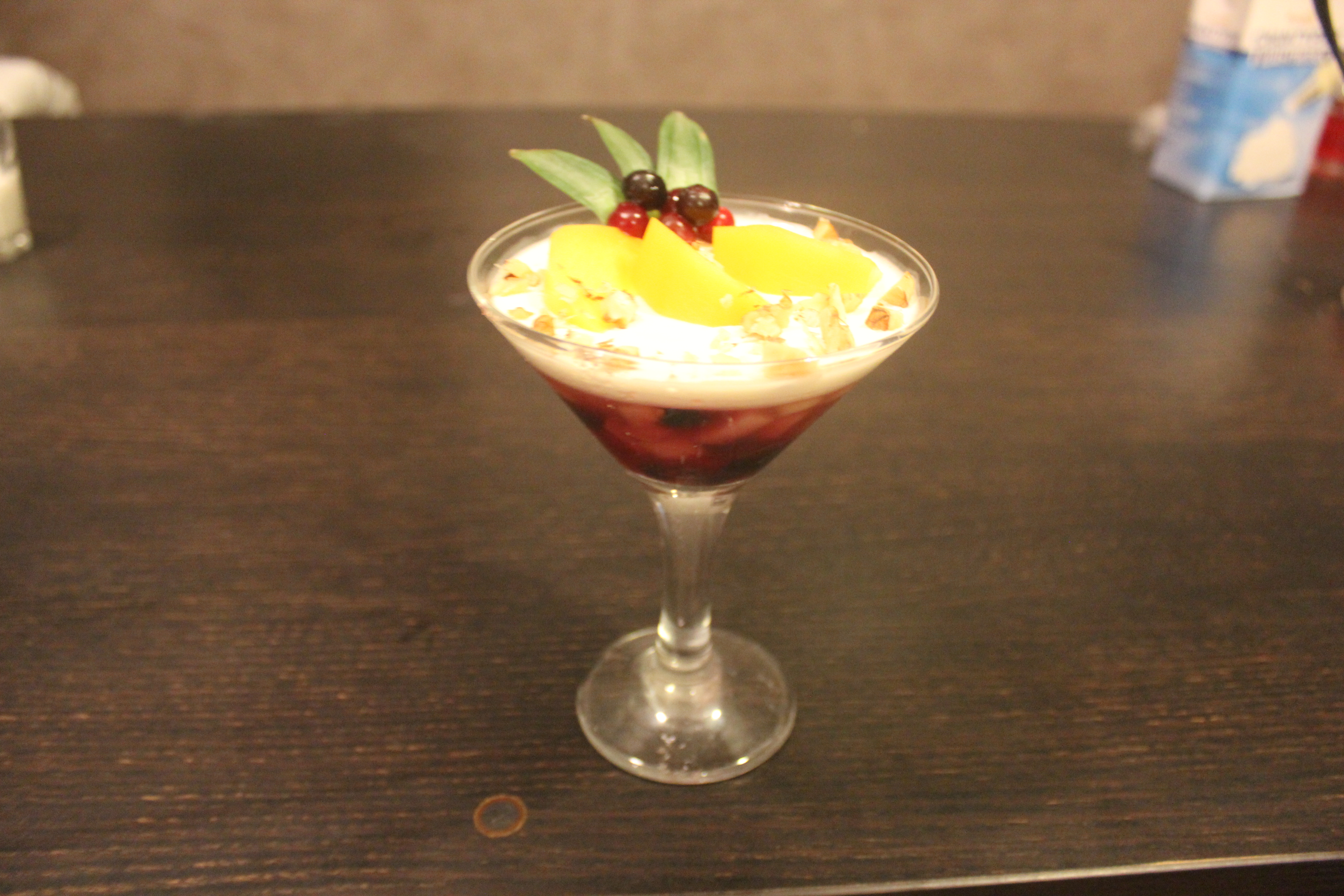 Добавляем в наш десерт кусочки хурмы, 3 листочка ананаса, несколько смородин, клюквы и размельченный орех и вуаля, десерт готов. Приятного аппетита!