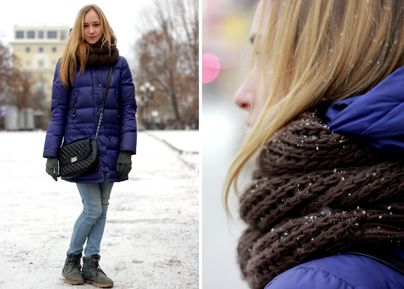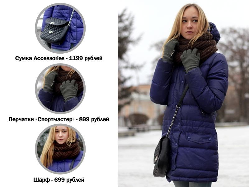 “Выбрала этот образ, потому что в нем удобно, а я чувствую себя уверенно. Огромный вязаный шарф Вershka за 699 рублей согревает от морозов. Куртка Reebok, 6999 рублей, выделяет меня из толпы. Это очень мне нравится. Ботинки ТОФА за 3799 рублей – удобные, на шнуровке и, самое главное, теплые. Сумка Аccessories за 1199 рублей не подходит к подобному образу, но это как раз по мне: сочетать несочетаемое”.