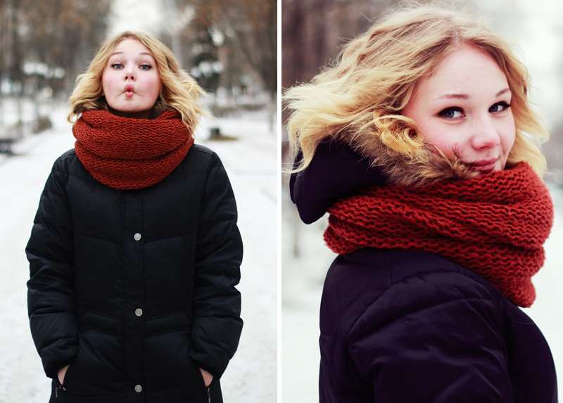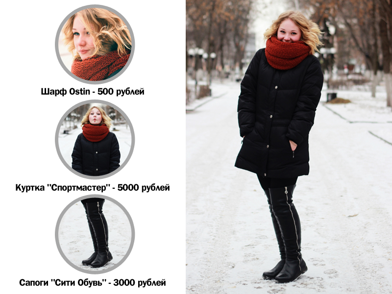 "Шарф "Остин" - просто и со вкусом, к тому же он огромный и тёплый, при желании можно и голову укутать. Куртка из "Спорт Мастера" объёмная, но удобная. Если во всех пуховиках люди - неповоротливые пингвины, то в этом я - шустрый пингвин. Очень удобно, особенно с моим быстрым ритмом жизни. Сапоги приобрела в "Сити Обувь". Они закрывают коленки. Можно и в мороз в платье походить".