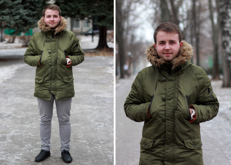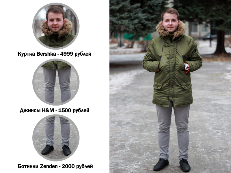"Куртку покупал в Bershka в этом году за 4999 рублей.Тёплая и, самое главное, не толстая. Джинсы из H&M покупал за 1500 рублей. Очень хотел светлые зауженные джинсы и только там нашел то, что мне понравилось. Ботинки Zenden приобрел за 2000 рублей. Самые удобные ботинки, которые я когда либо покупал. Мало того,что удобные, так еще и выглядят неплохо".