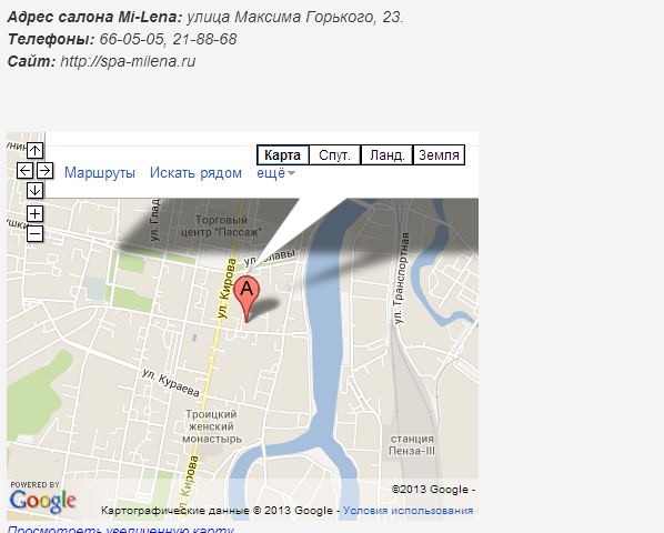 Спа-салон красоты Mi-Lena ("Милена") заботится не только о красоте и здоровье своих клиентов: помимо этого важен и их комфорт. Именно поэтому салон располагается в самом центре города (сразу за филармонией? напротив "HELIOPARK") и работает с 10.00 до 22.00.
