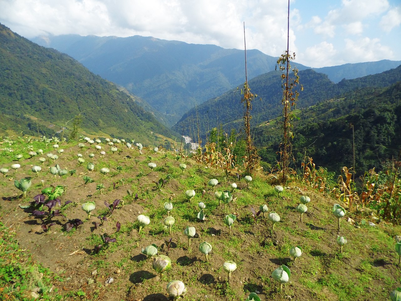 В предгорьях Гималай непальцы выращивают чай, гречиху и овёс. Но особенно было прикольно увидеть до боли знакомые ряды капусты на такой высоте.