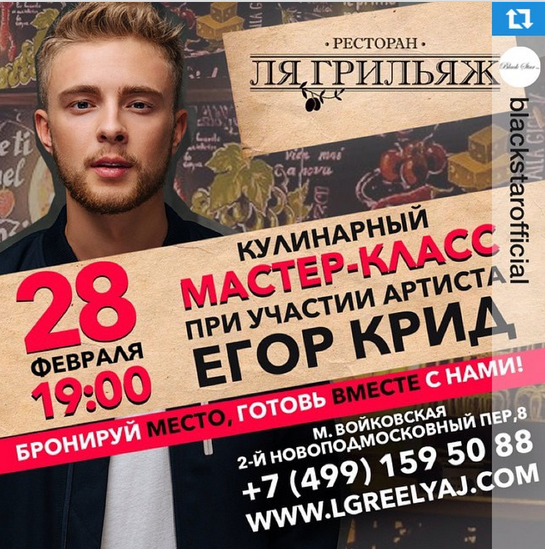 "Кулинарный мастер-класс с Егором Кридом для тех, кто любит готовить и петь одновременно. Успей забронировать место в ресторане "Ля Грильяж" и приготовь себе ужин с Егором Кридом!"