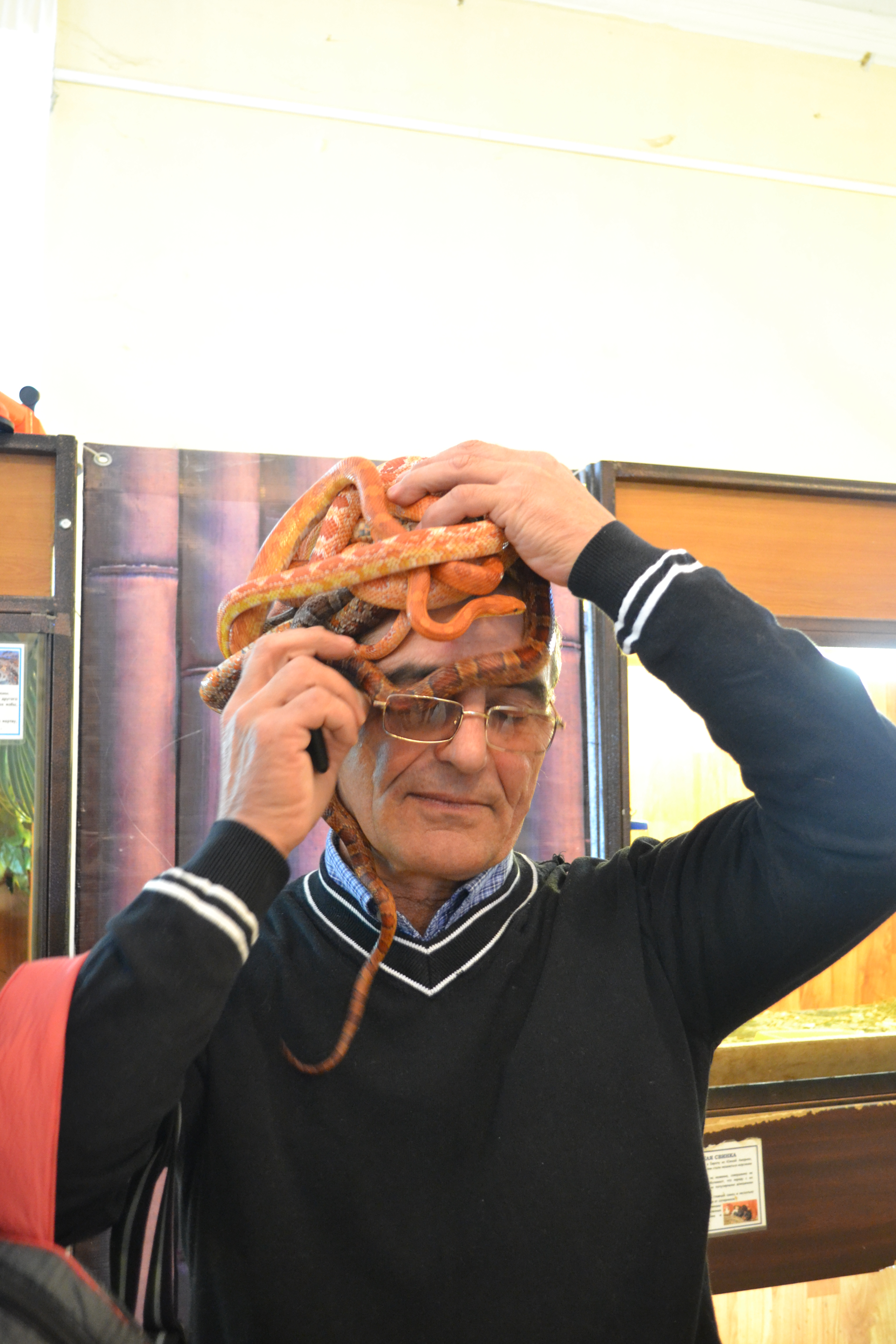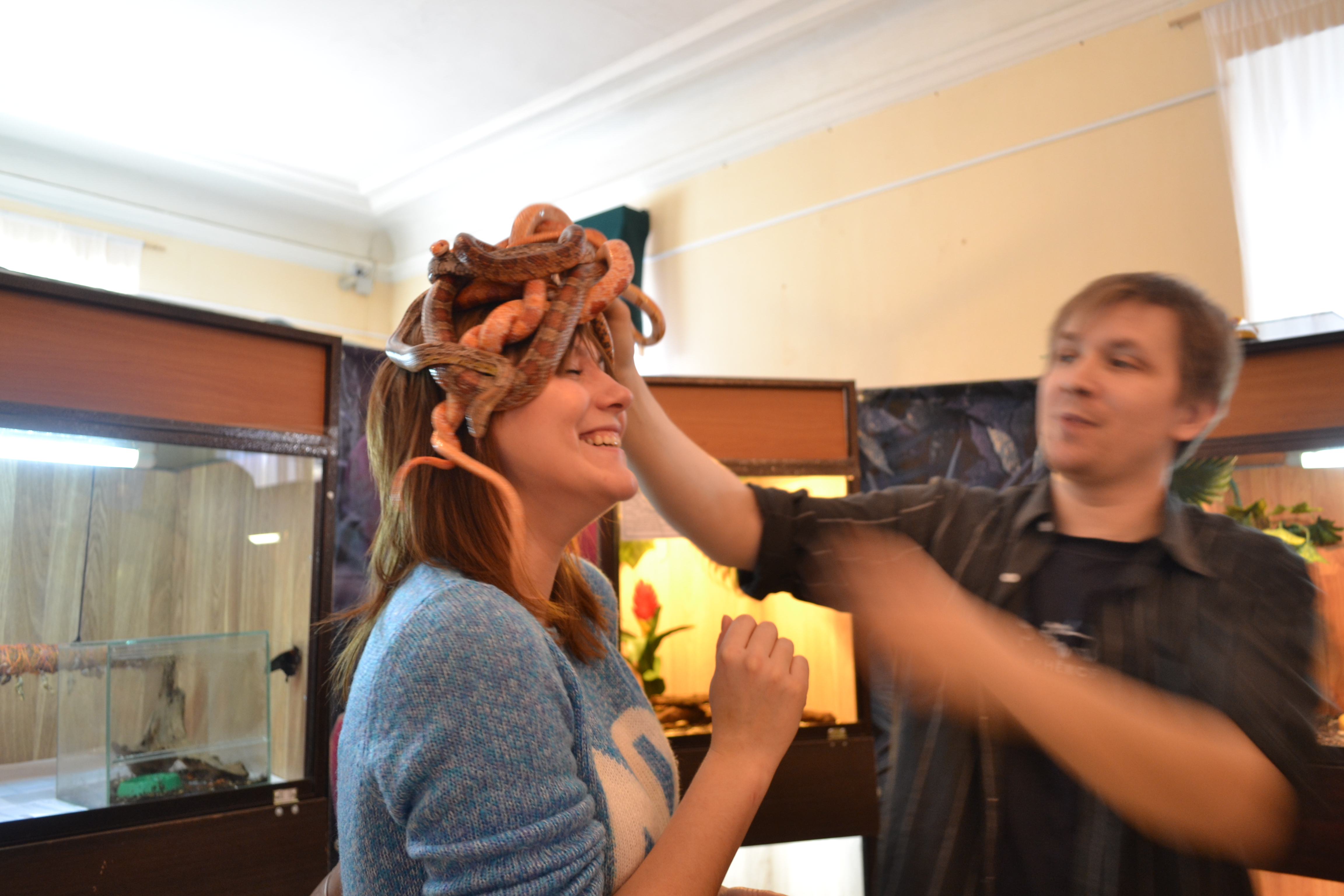 Но не только мы, представители СМИ, трогали и гладили каждого участника выставки. К примеру, Александр Еремин и Наталья Колесникова (гости зоопарка) решились (ВНИМАНИЕ!) положить охапку змей себе на голову! Поражаюсь их смелости!