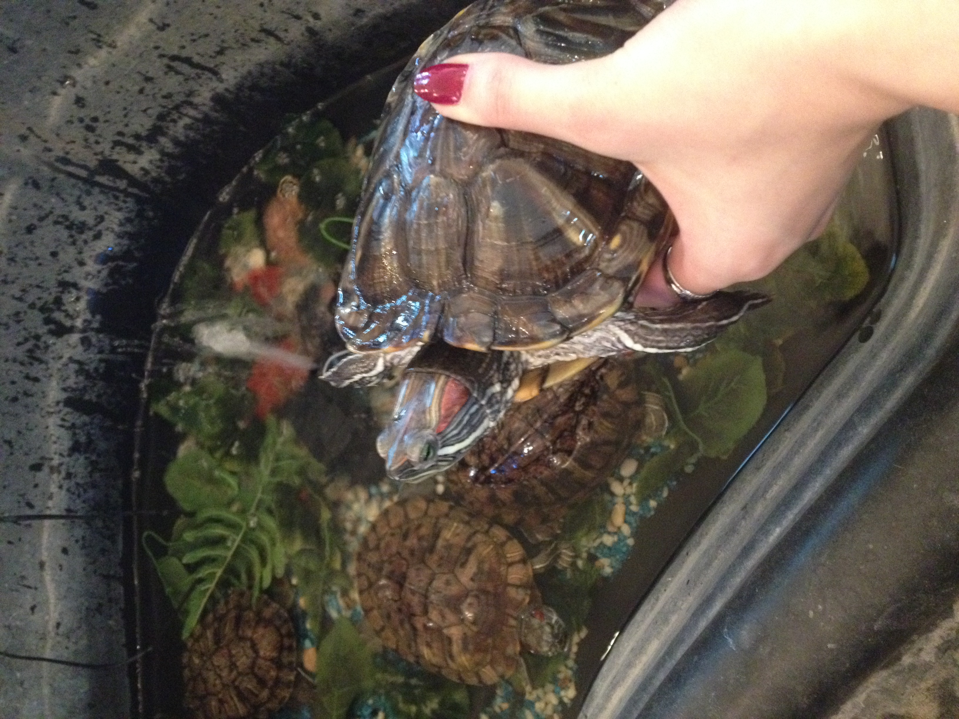 Черепах в контактном зоопарке также несколько видов. Малыш - самый крупный и сильный. Мы с коллегами также обратили особое внимание на красноухих черепах. Сейчас расскажу, почему. У нас в офисе также живет красноухая черепаха по имени Гоша. Только она размером со спичечный коробок. В контактном же зоопарке существа этого вида раз в 20 больше. Поэтому мы очень испугались, что Гоша вырастет и станет таким же огромным. Тогда ему придется покупать не аквариум, а целый бак.