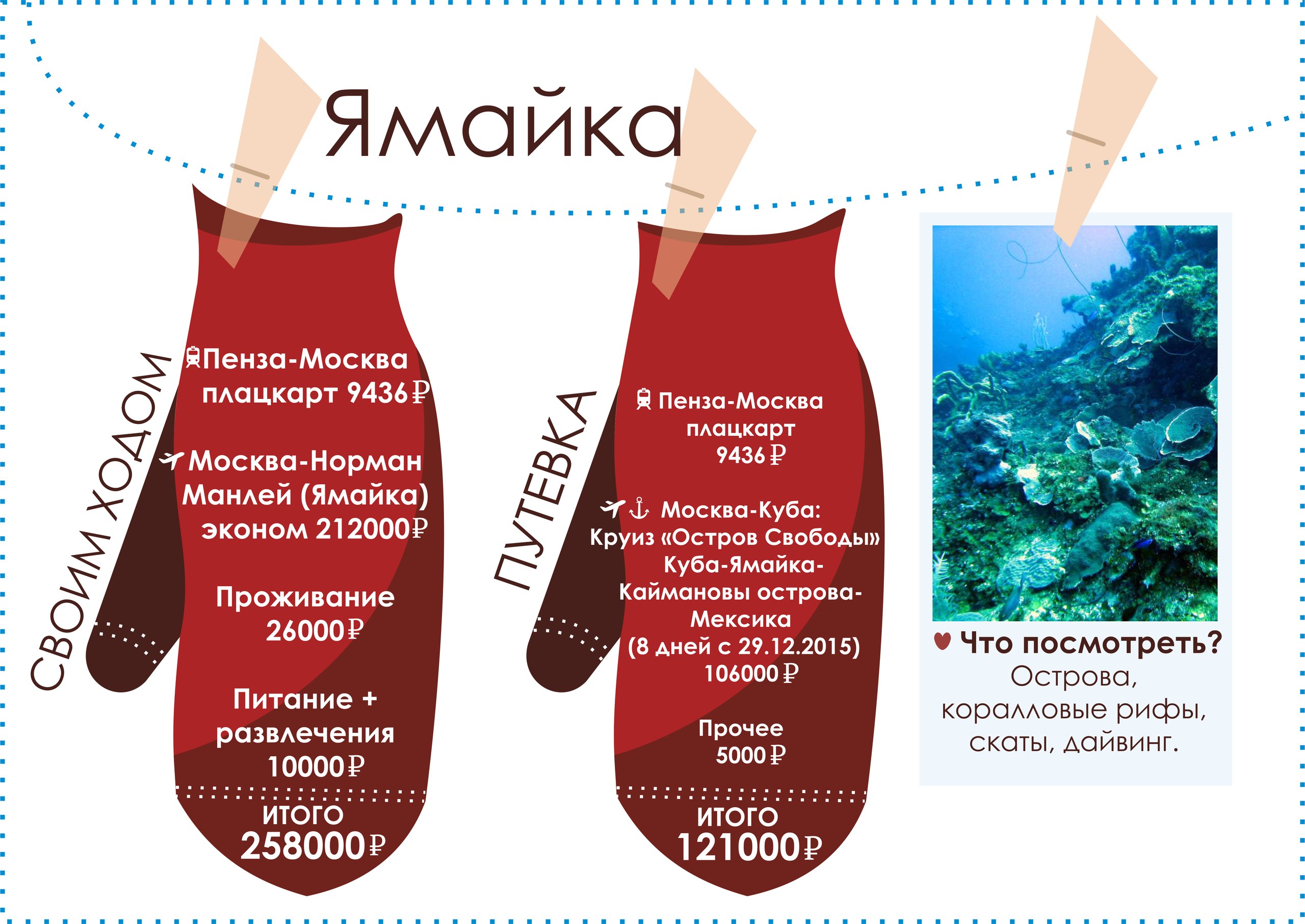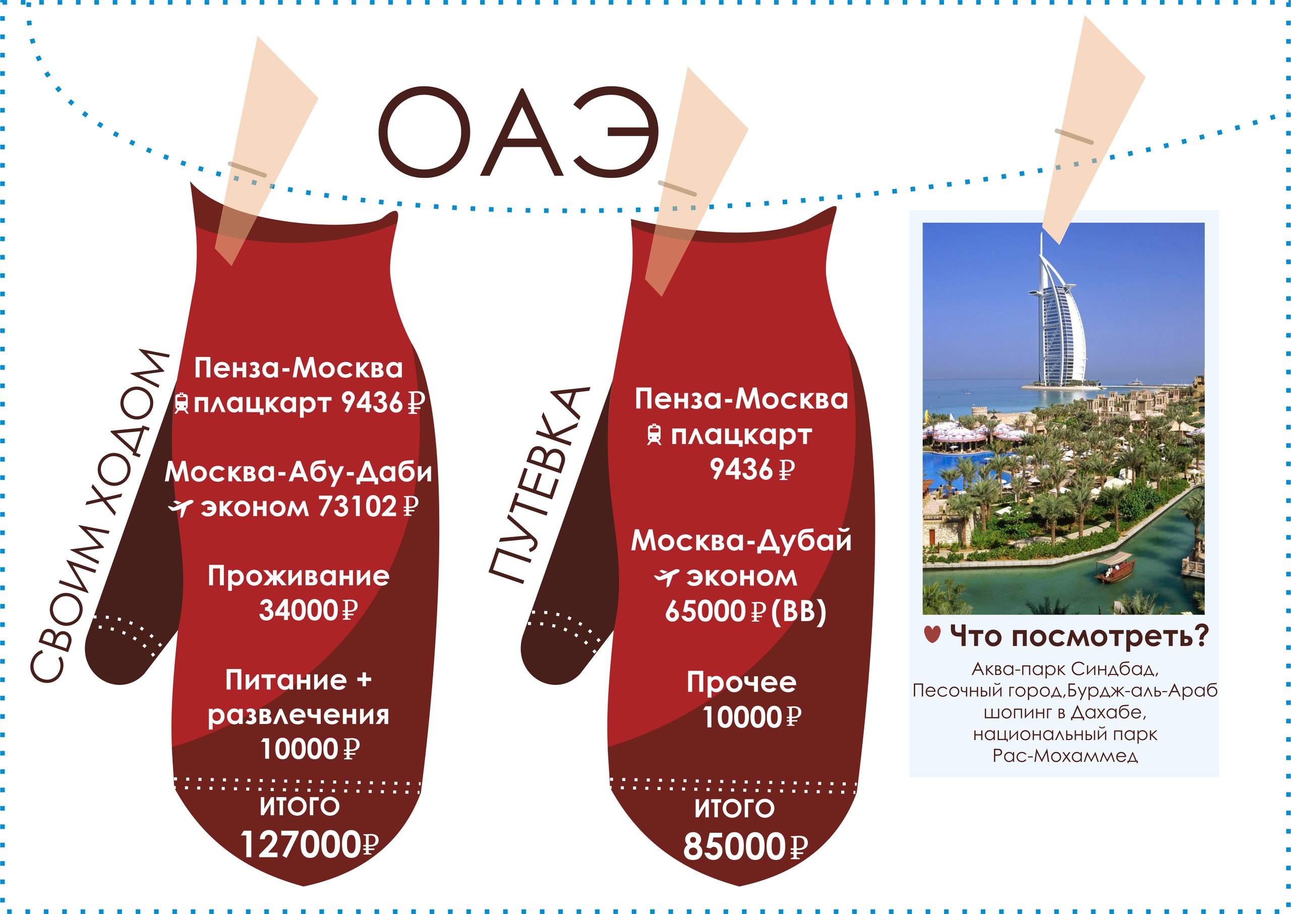 Все поездки посчитаны из расчета на двоих взрослых. Цены на билеты указаны с учетом сезонного повышения. Время поездки предусматривает вылет из Москвы 30 декабря, проживание в стране отдыха 7 ночей и возвращение на родину 6 января. Обратите внимание, что для ОАЭ, Ирландии и Риги требуется оформление визы. Им нужно заняться уже сейчас.