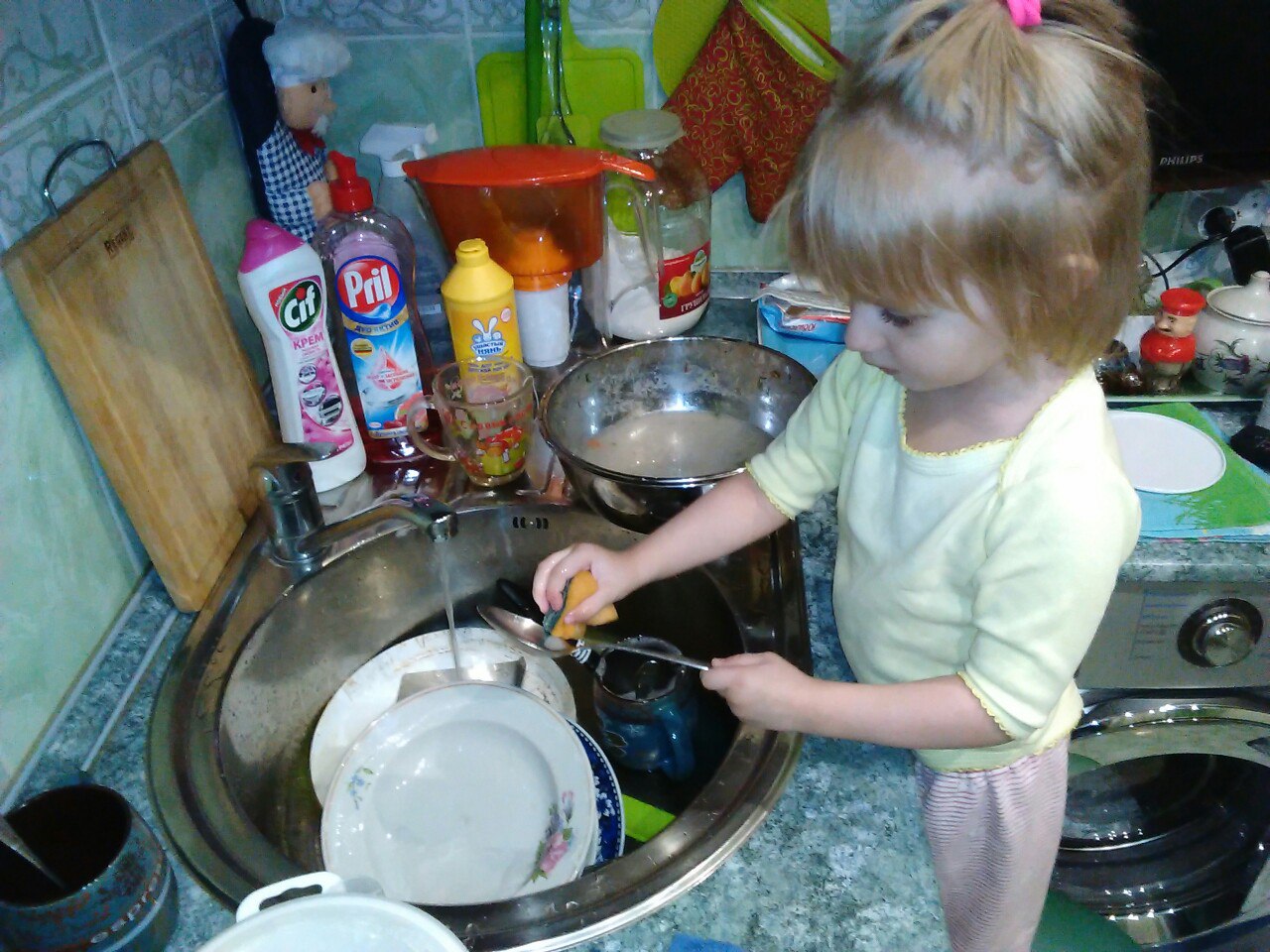 «Самое любимое лакомство в нашей семье от мала и до велика - вафли, сделанные своими руками. Конечно, в приготовлении его нам помогают дети. Это маленький поваренок, Софья, после семейного чаепития с домашними вафлями помогает маме мыть посуду за всей семьей».