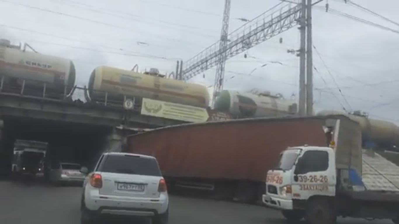 В Пензе фура застряла под Бакунинским мостом. Очевидцы сняли этот момент на видео.