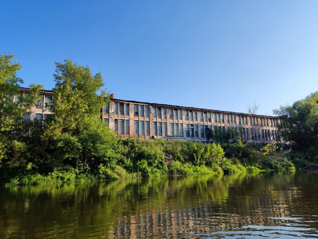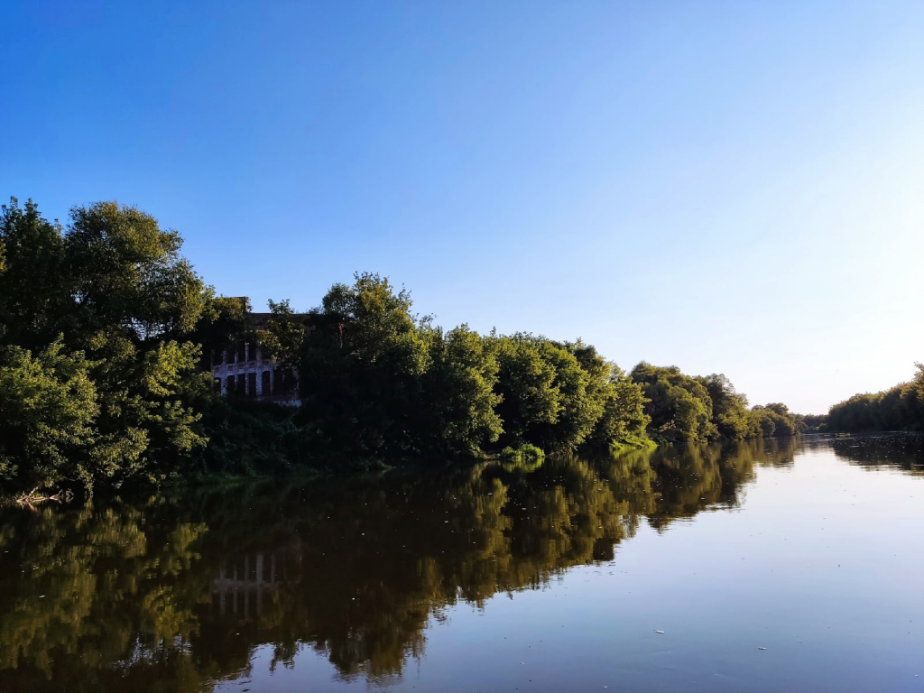 Колорит в путешествие на этом отрезке пути внесла старая заброшенная ткацкая фабрика. Кладка была похожа на дореволюционную. Здание растянулось на сотни метров по берегу Суры и вызывало в мыслях ассоциации с потерянным миром: безлюдные берега, нетронутая природа, забытое место, которое ранее было оживленным, а теперь будто забыто самим богом. Портил атмосферу только запах, доносившийся с близлежащих ферм.