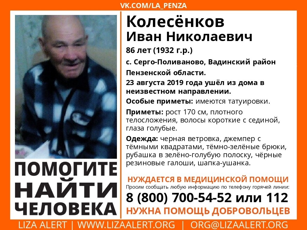 Иван Колесёнков ушел из дома 23 августа в селе Серго-Поливаново, Вадинского района Пензенской области. С тех пор о нем ничего не известно, в каком направлении выдвинулся тоже никому не сообщил.