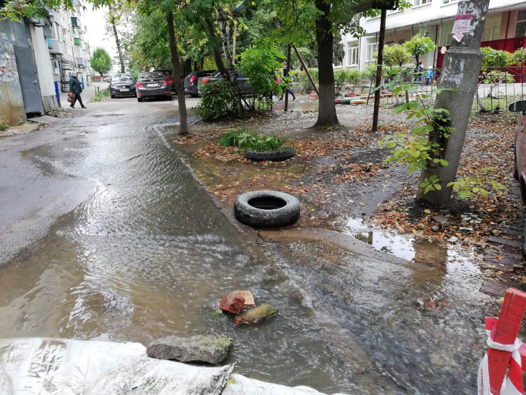 Возле детской поликлиники на проспекте Победы, 29 огромный поток воды течет из под земли, дети и родители с колясками вынуждены переходить огромную лужу по доскам.