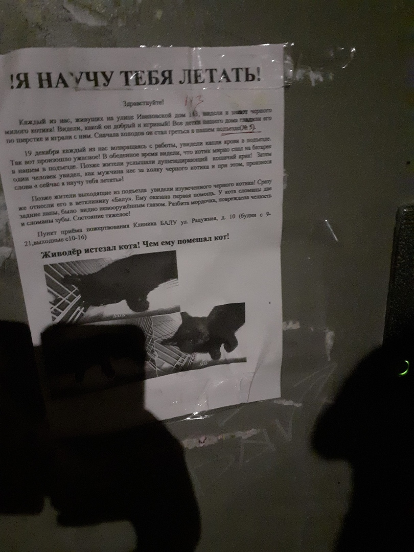 Если рассказывать кратко, то 19 декабря жители подъезда увидели капли крови на полу. Затем житель увидел, как неизвестный мужчина нес за холку черного котика. При этом, судя по объявлению, мужчина кричал "Я научу тебя летать!", намереваясь выкинуть бедного зверя.