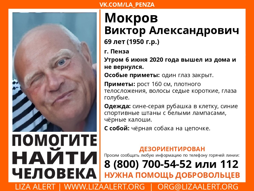 Сегодня, 6 июня, в Пензе пропал пожилой мужчина. Об исчезновении 69-летнего Мокрова Виктора Александровича сообщает поисковый отряд «Лиза Алерт».