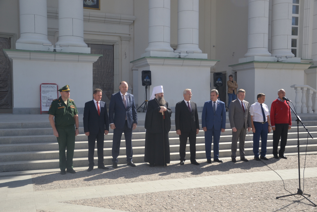 Иван Белозерцев, митрополит Пензенский и Нижеломовский Серафим, Валерий Лидин направляются к соборной площади для награждения в номинации "Лучший рабочий Пензенской области".