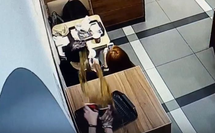 В социальных сетях появилось видео, на котором запечатлен необычный поступок подростка в ресторане быстрого питания. Несовершеннолетний со спины подошёл к двум девушкам, сидевшим за столиком, после чего вылил на них жидкость из стаканов.