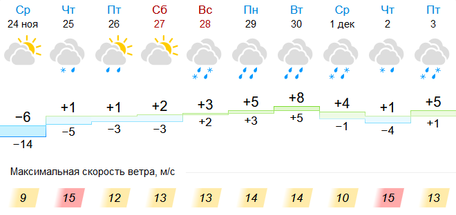 Согласно прогнозу «Гисметео», в ближайшие дни температура воздуха днём будет подниматься до +1 градуса. На следующей же неделе прогнозируется потепление до 8 градусов тепла.
