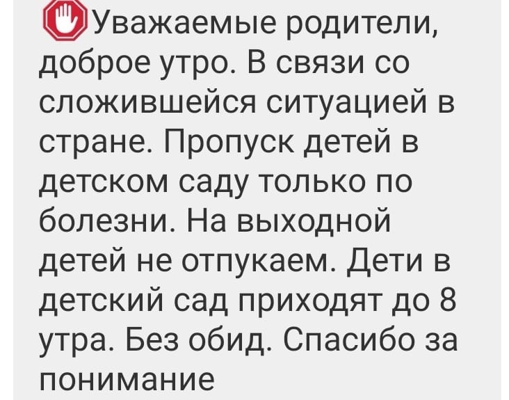 На днях в родительский чат пришло сообщение, что с этого дня пропуски детского садика возможны по болезни и вводится это из-за сложившейся ситуации, - говорит Елена. - Конечно, я была удивлена, ведь ранее не по болезни можно было пропускать учреждение до пяти дней. А вдруг нужно куда-то уехать с ребенком или что-то случится. Как быть в таком случае? Имеет ли право садик ставить такие рамки?