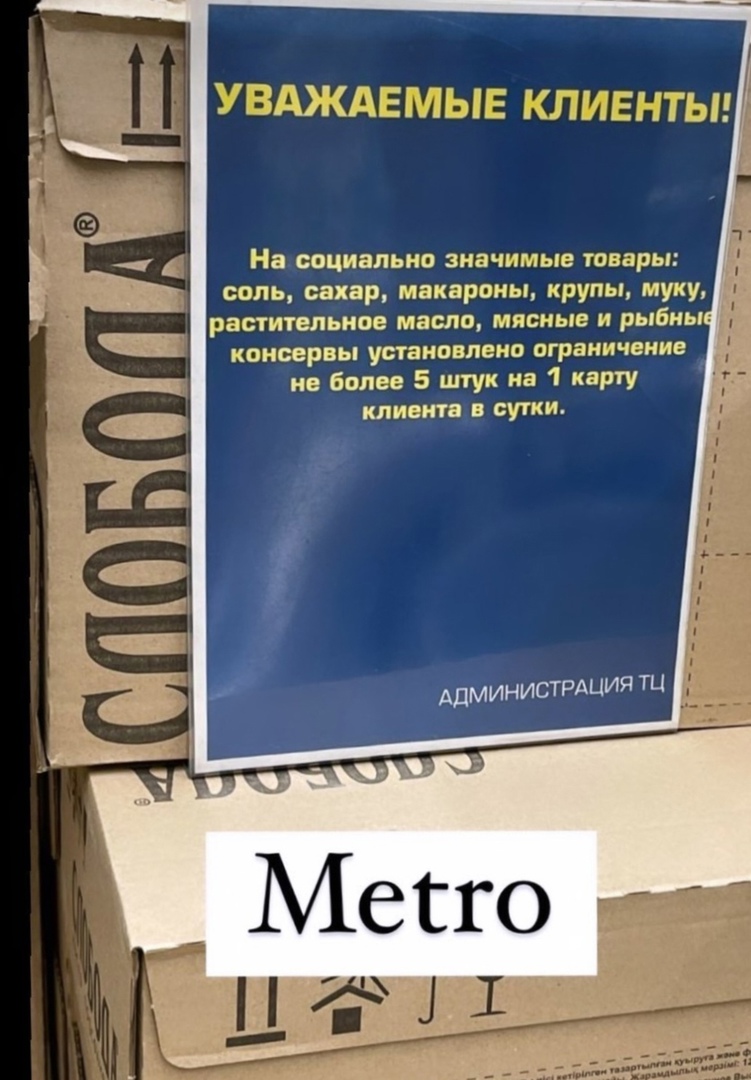 Так, на днях в одном из гипермаркетов появилась табличка, что на социально значимые объекты, такие как сахар, соль, макароны, крупы, мука, растительное масло, мясные и рыбные консервы установлено ограничение. Можно купить не более пяти штук на 1 карту клиента в сутки. Многие горожане удивились, увидев такое объявление, а некоторые даже испугались.