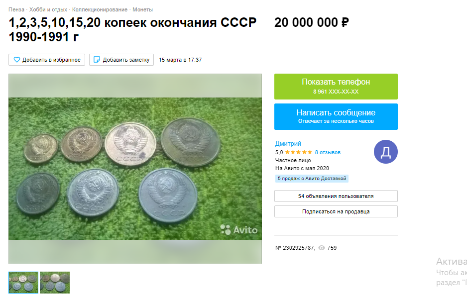 2 место - Монеты СССР 1991 года. Автор в объявлении указывает: "Монеты в хорошем состоянии, не чистились, все в естественном состоянии, есть и другие года. Цена договорная при звонке или сообщение". Причем, он утверждает, что цена такая, только для привлечения внимания.