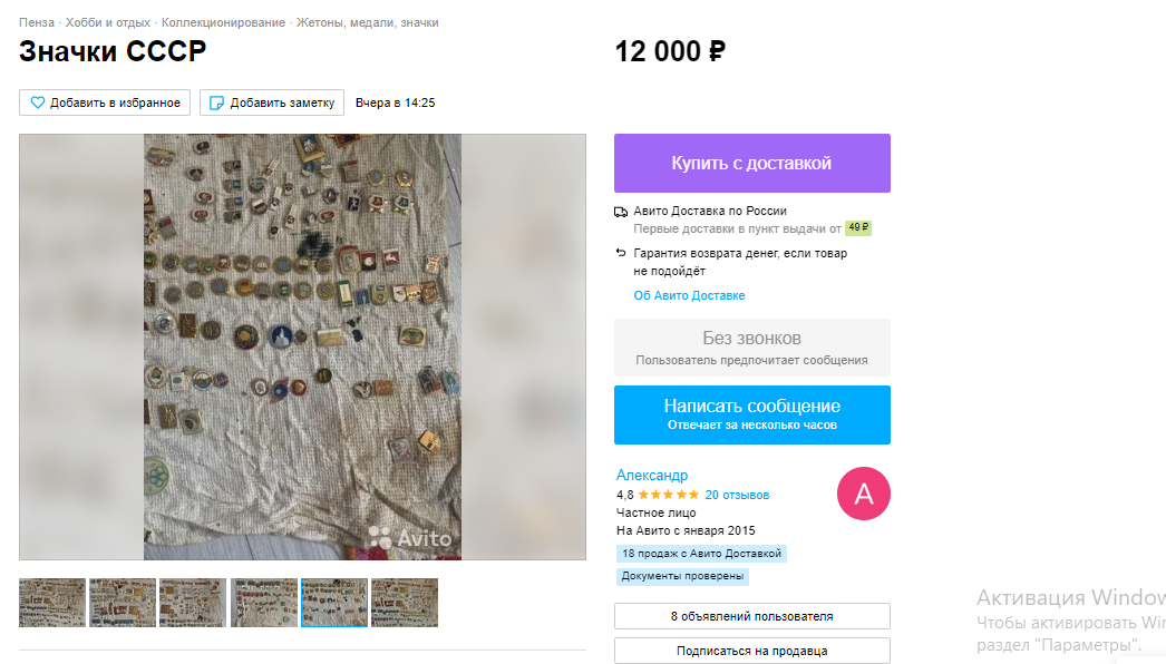 3 место — коллекция значков СССР за 12 тысяч рублей. Автор продает только коллекцией, поштучно отдавать не готов, и объявил за всю коллекцию.
