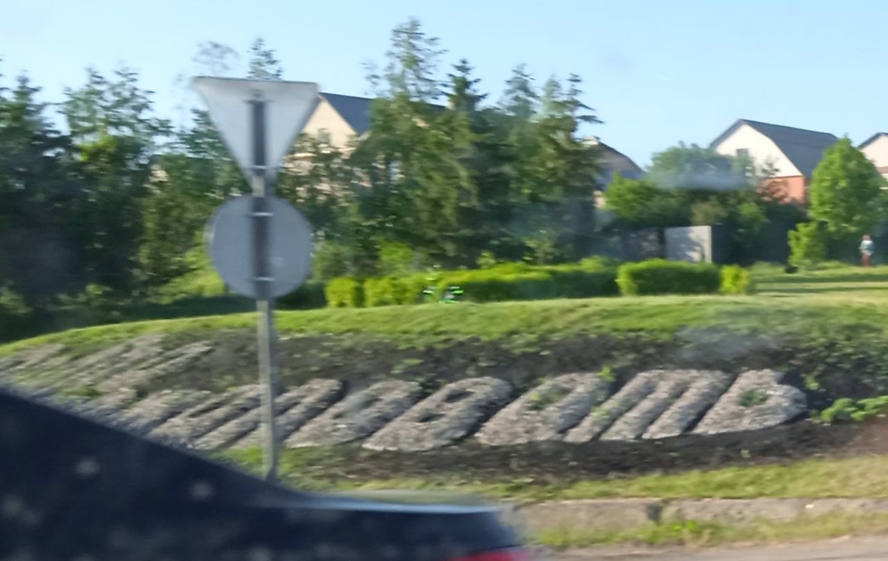 Надпись выложена камнями на газоне большими буквами и орошо видна для всех, кто едет.