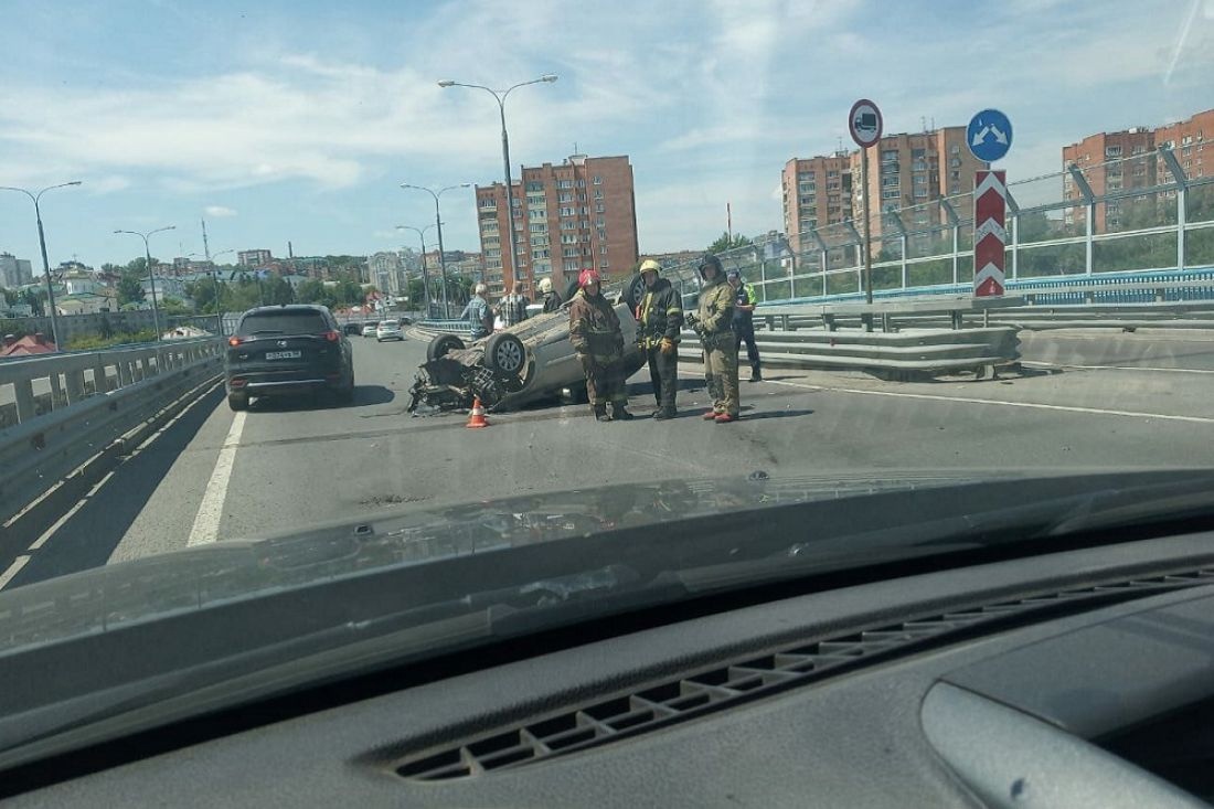 Сегодня, 7 июля, около 12.00 в Пензе произошла авария, на мосту легковушка перевернулась на крышу. На место ДТП приехала машина МЧС.