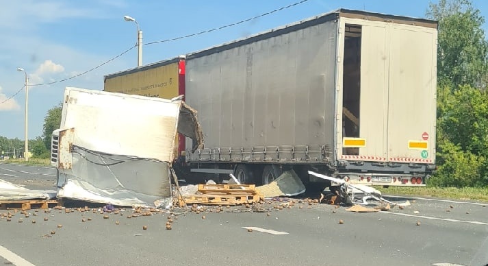 На фото видно, что на обочине стоит фура, а на дороге лежат деревянные поддоны, разбросаны фрукты и овощи.