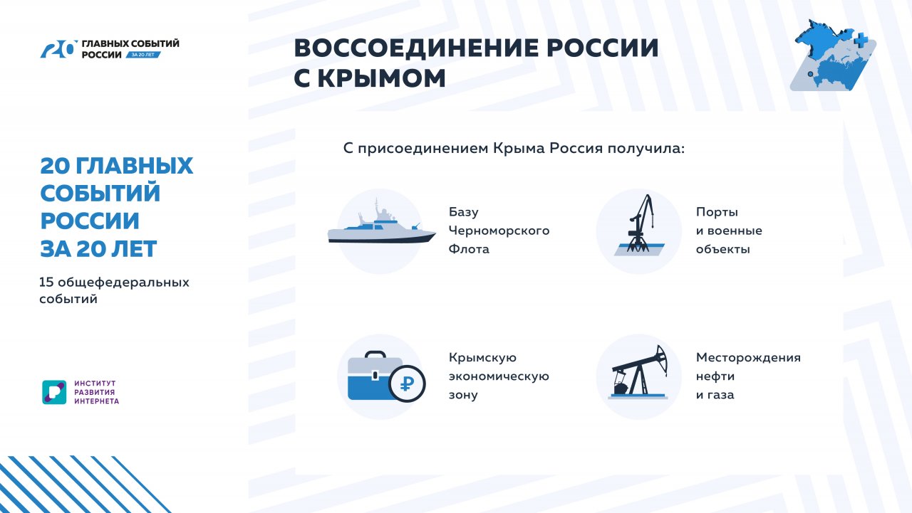 Но главный результат этого исторического решения – это люди. Почти два миллиона крымчан вернулись в родную культуру и языковую среду, смогли почувствовать себя в безопасности. В материковой России же с момента присоединения Крыма отмечается небывалый эмоциональный подъем. Восстановление исторической справедливости дало мощный рост национального самосознания.