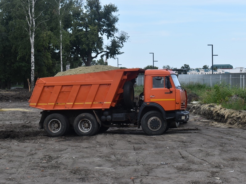 Сейчас формируются пешеходные зоны и велодорожки вдоль улицы Урицкого. Завозят песок на основание площадки для скейтбординга. Недалеко от нее по проекту будет расположен амфитеатр.