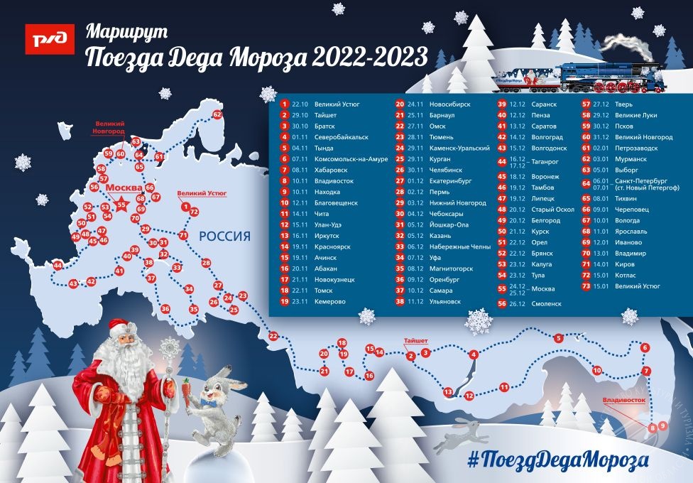 В Пензу 12 декабря приедет поезд Деда Мороза, он будет состоять из 19 вагонов и будет курсировать в этом году 85 дней. В его маршруте 130 городов, отправление состоится из Великого Устюга.