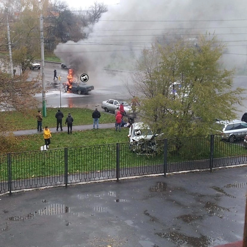 После столкновения кроссовер отбросило на газон, а "Волга" загорелась. Судя по фото, автомобиль выгорел полностью.