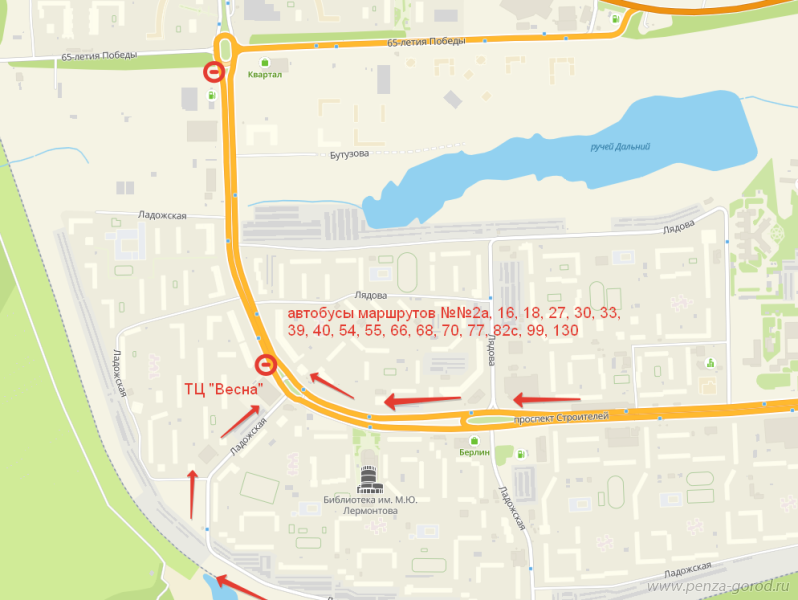 Проехать и припарковаться нельзя будет на участке от выезда с кругового движения на улице 65-летия Победы до поворота на улицу Ладожскую с четной стороны. Поэтому автобусы маршрутов №2а, 16, 18, 27, 30, 33, 39, 40, 54, 55, 66, 68, 70, 77, 82с, 99, 130 будет идти по-новому. В направлении микрорайона «Арбековская застава» общественный транспорт доедет только до ТЦ «Весна».